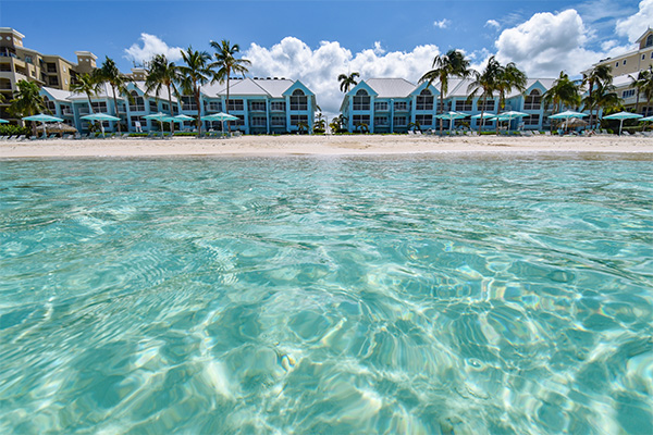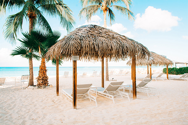 Our guests enjoy all the essentials for a perfect beach day on the widest, deepest stretch of Seven Mile Beach with comfortable lounge chairs, large sun umbrellas, shaded beach cabanas, complimentary beach towels, and beach volleyball and toys for added fun.