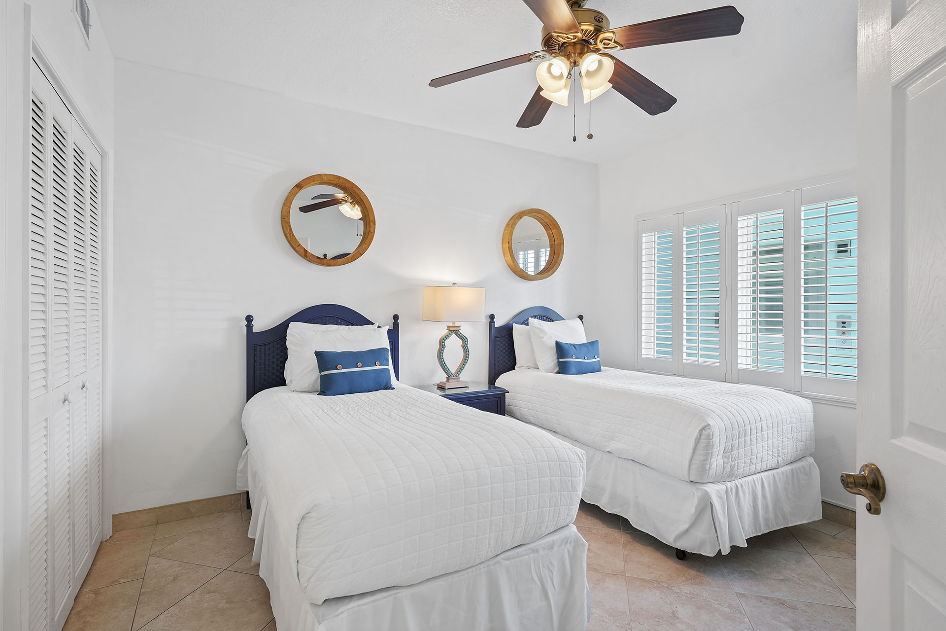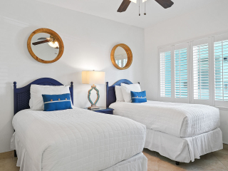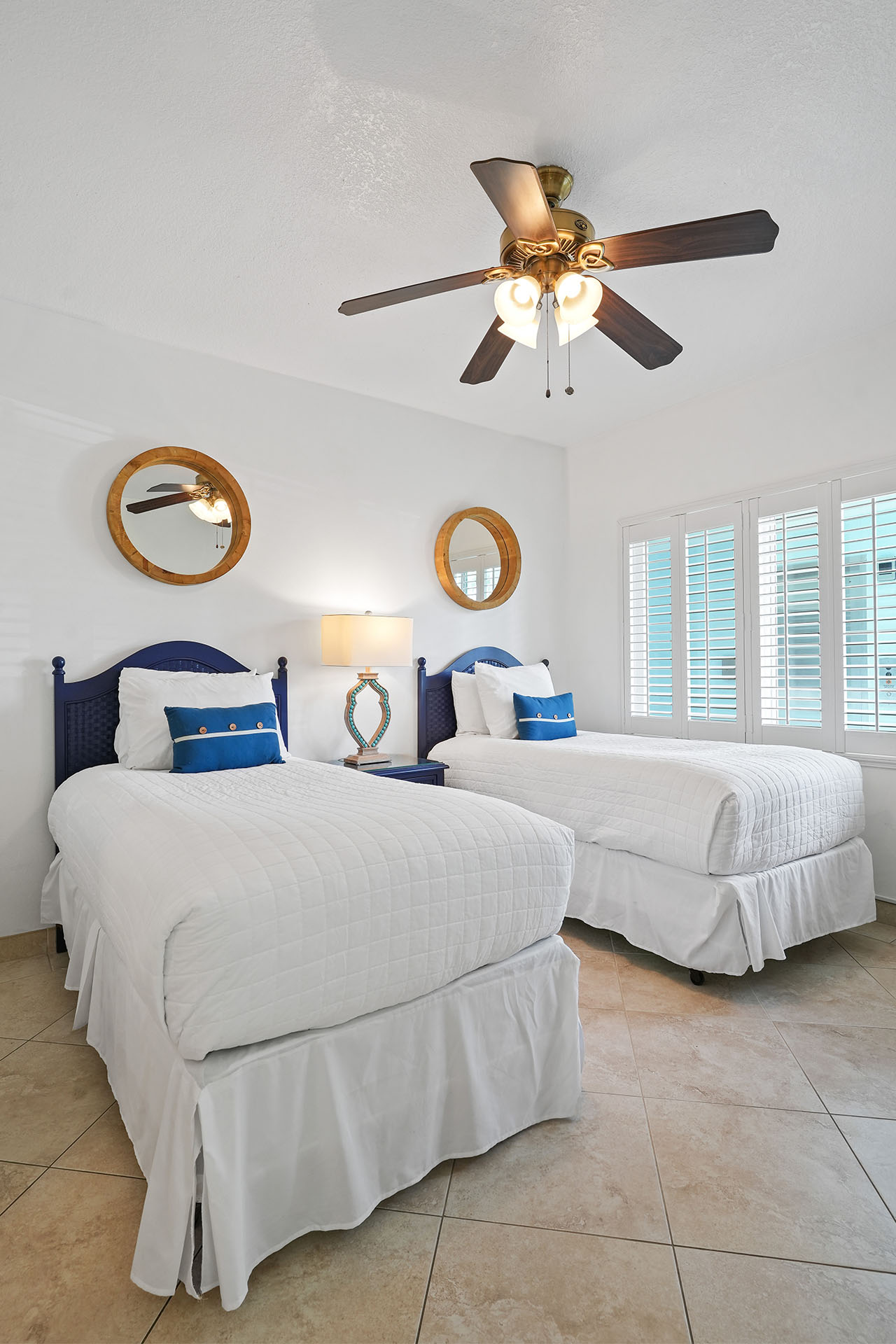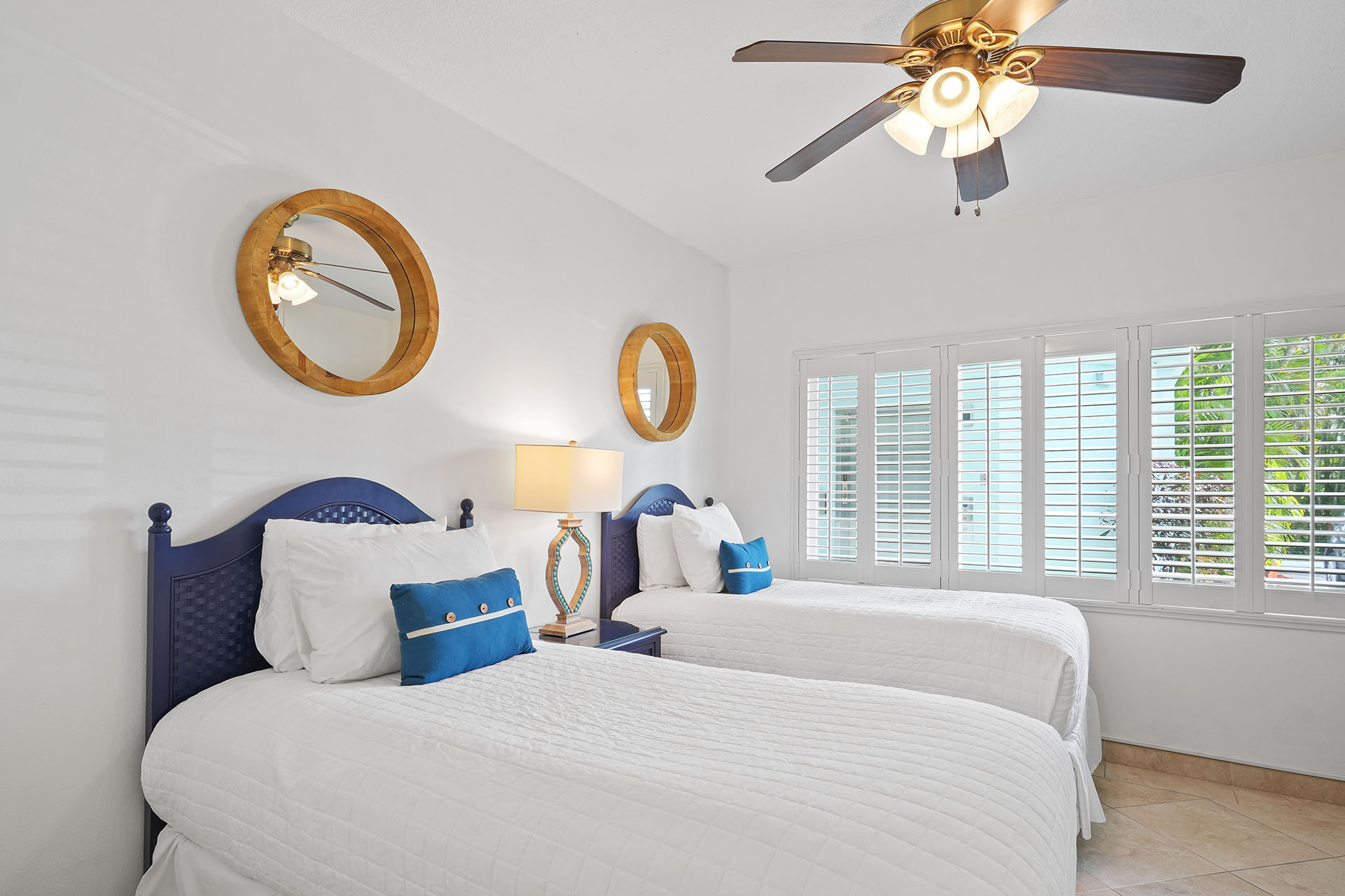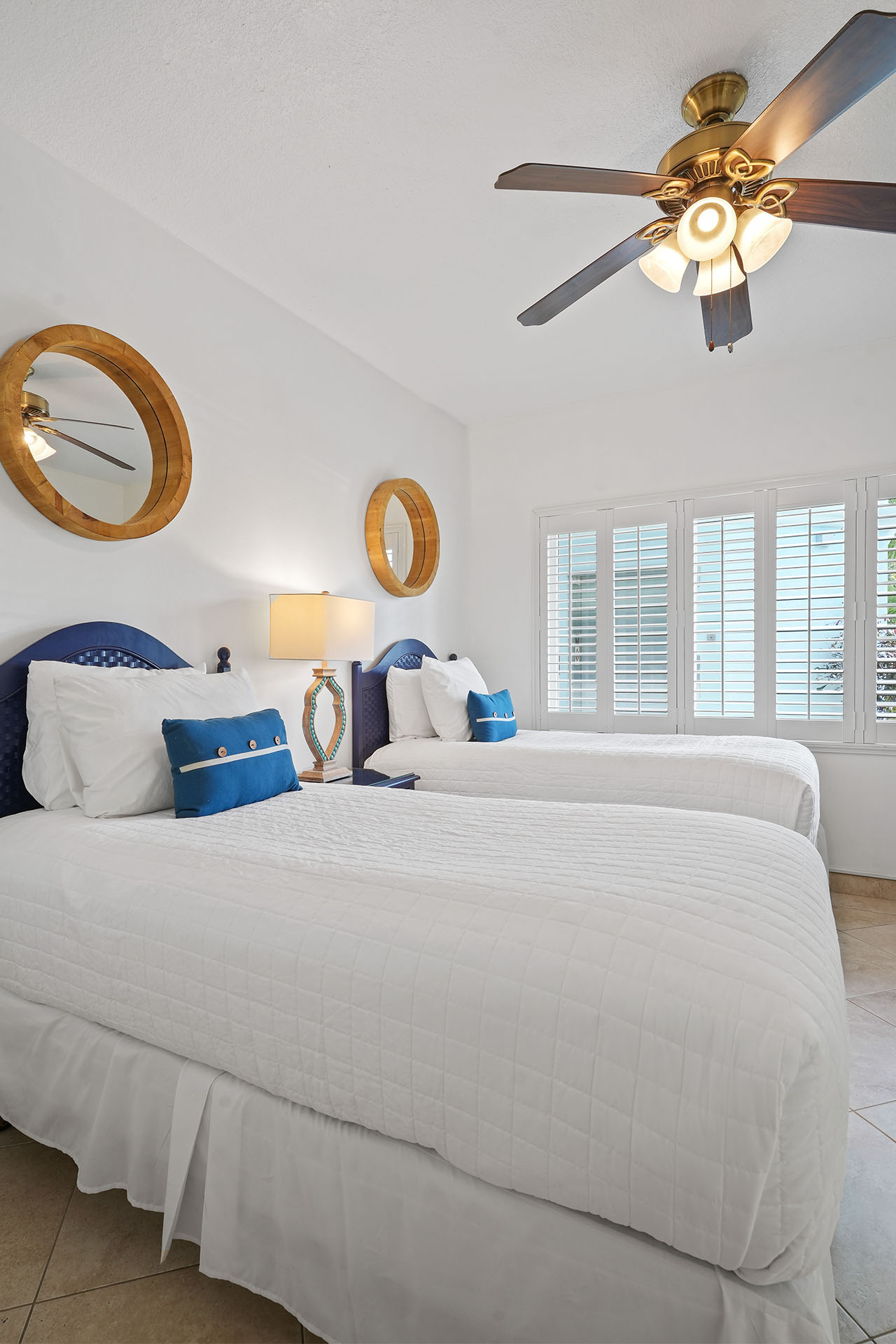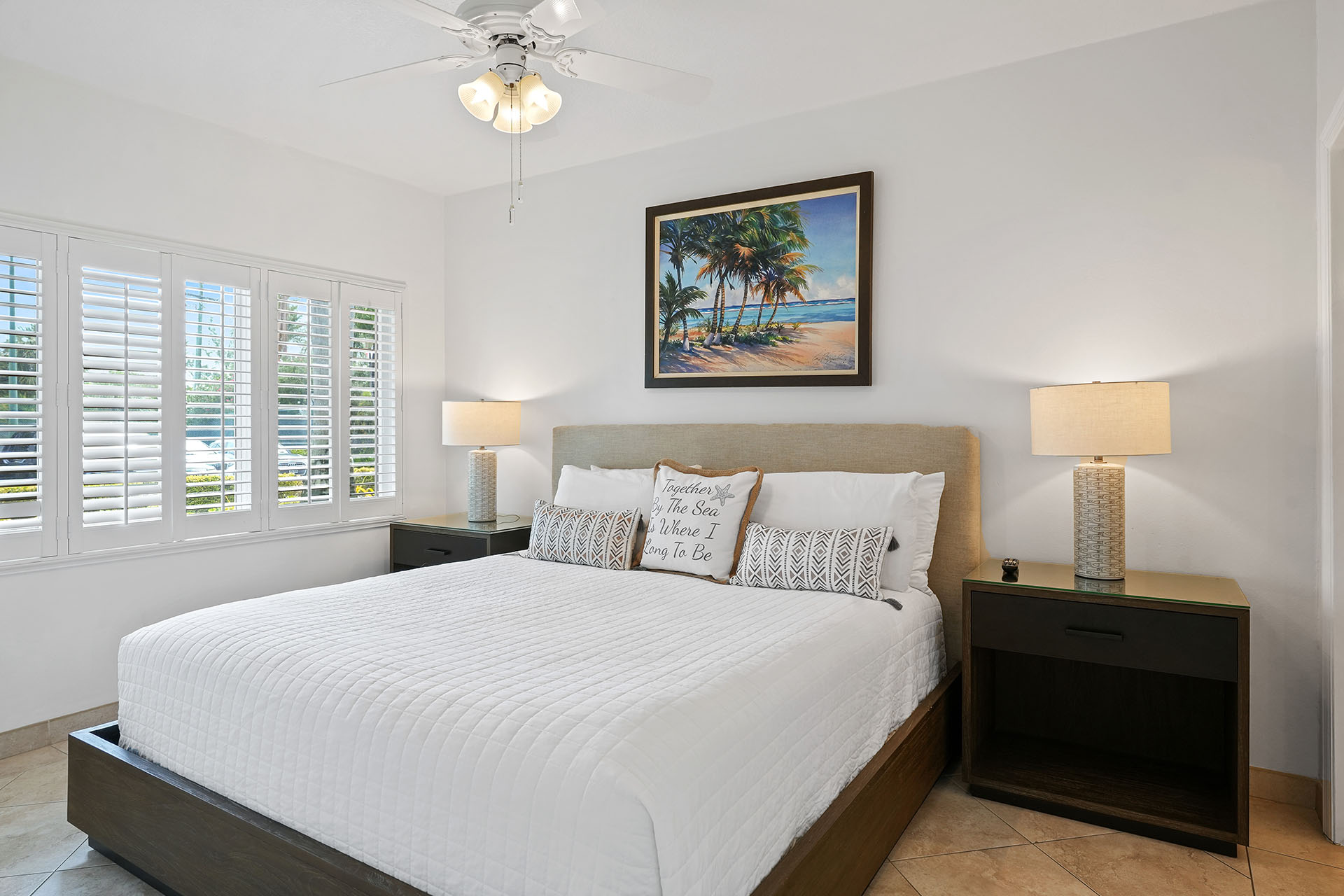 With 1,800 sq. ft of space, the three bedrooms are beautifully appointed, each featuring its own ensuite bathroom. The primary bedroom features a King size bed and a glass and tiled walk-in shower, while the guest bedroom offers a Queen bed, and an additional guest bedroom features two Twin beds that can be converted into a King bed upon request. Each bedroom is adorned with tropical linens and decor, adding to the island ambience.