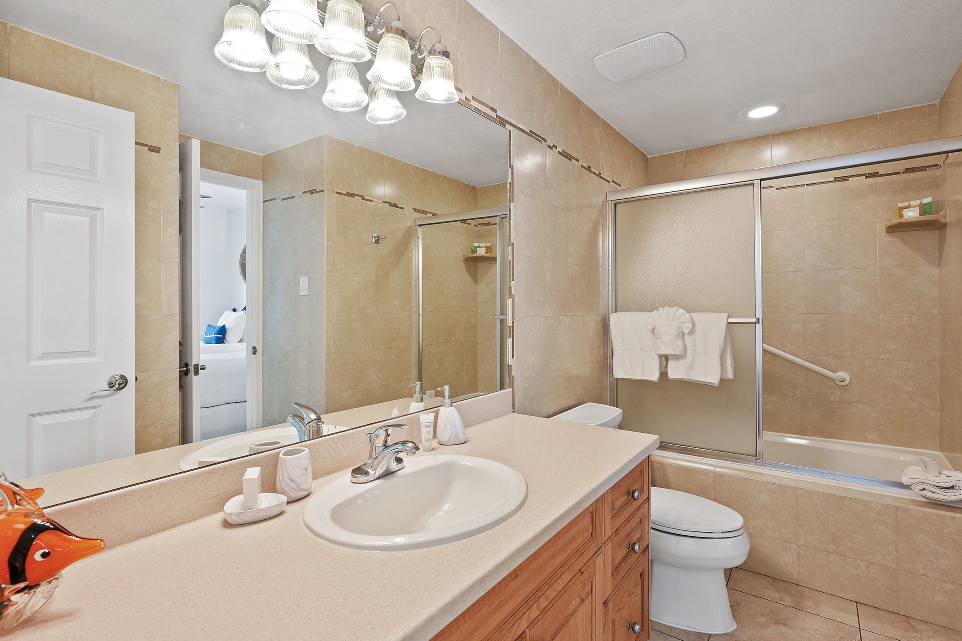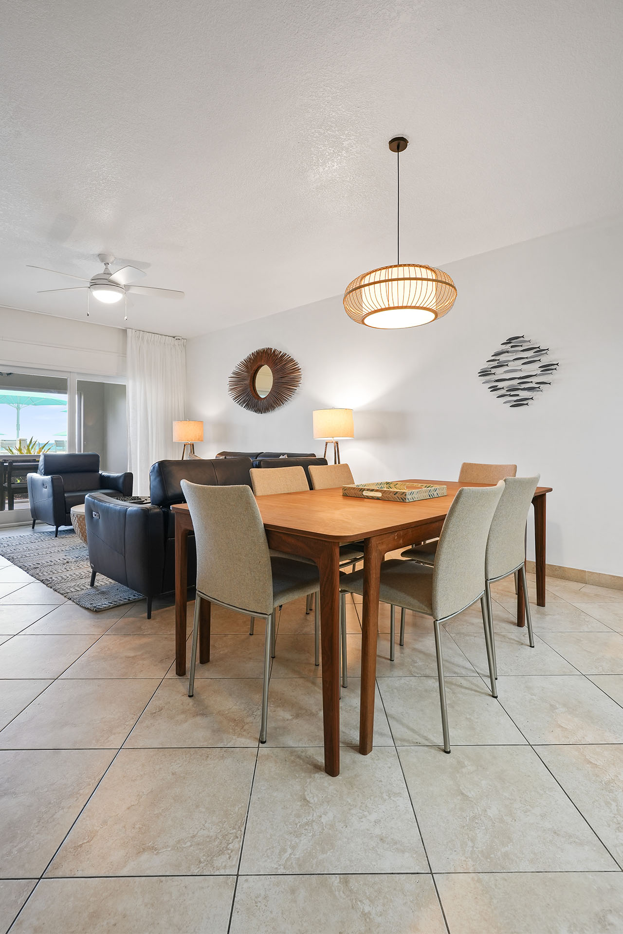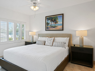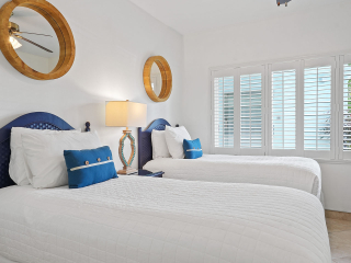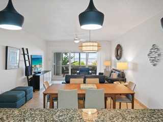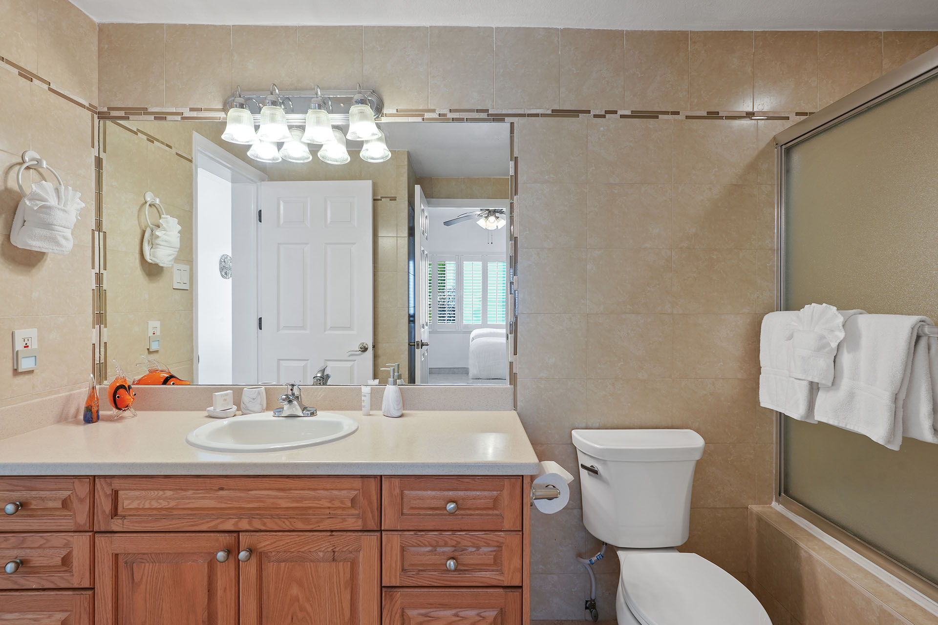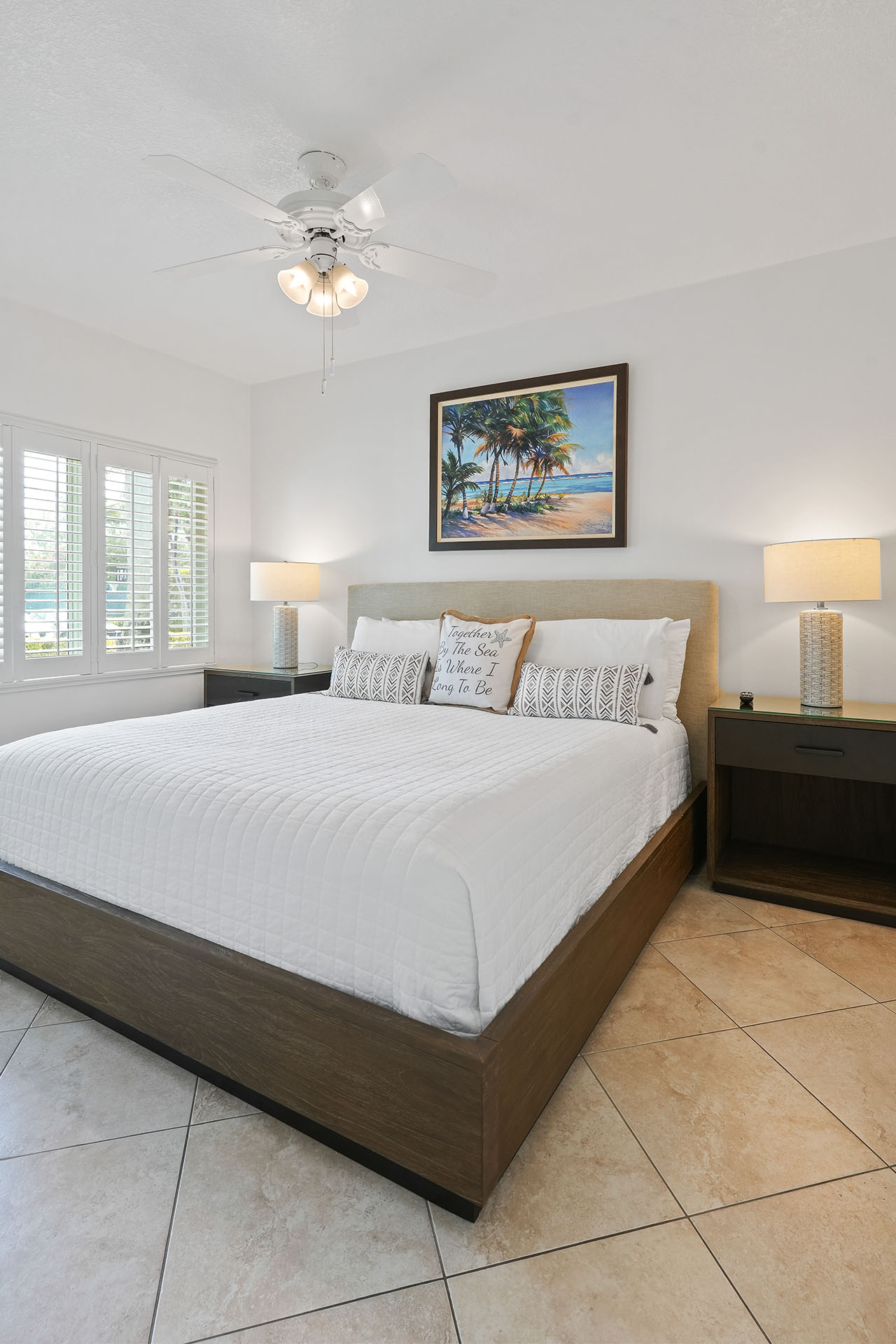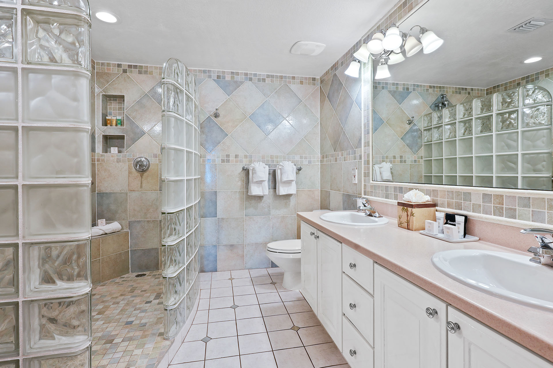 With 1,800 sq. ft of space, the three bedrooms are beautifully appointed, each featuring its own ensuite bathroom. The primary bedroom features a King size bed and a glass and tiled walk-in shower, while the guest bedroom offers a Queen bed, and an additional guest bedroom features two Twin beds that can be converted into a King bed upon request. Each bedroom is adorned with tropical linens and decor, adding to the island ambience.