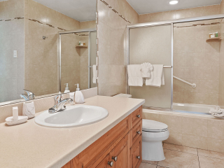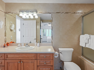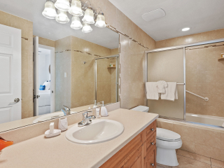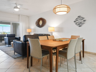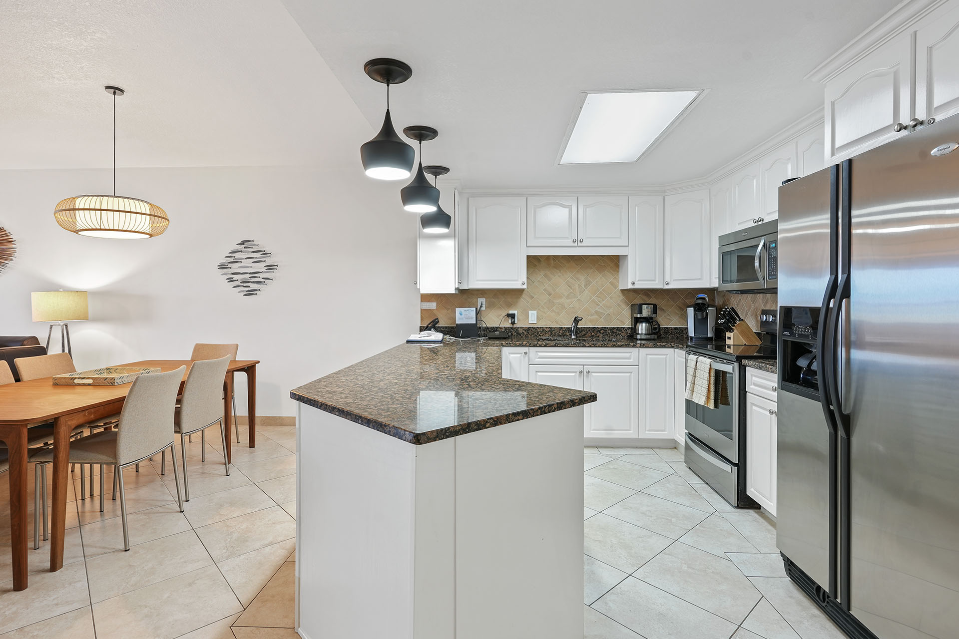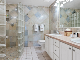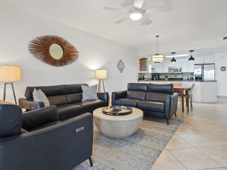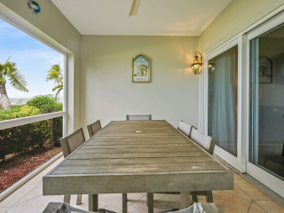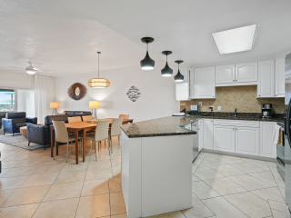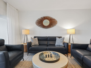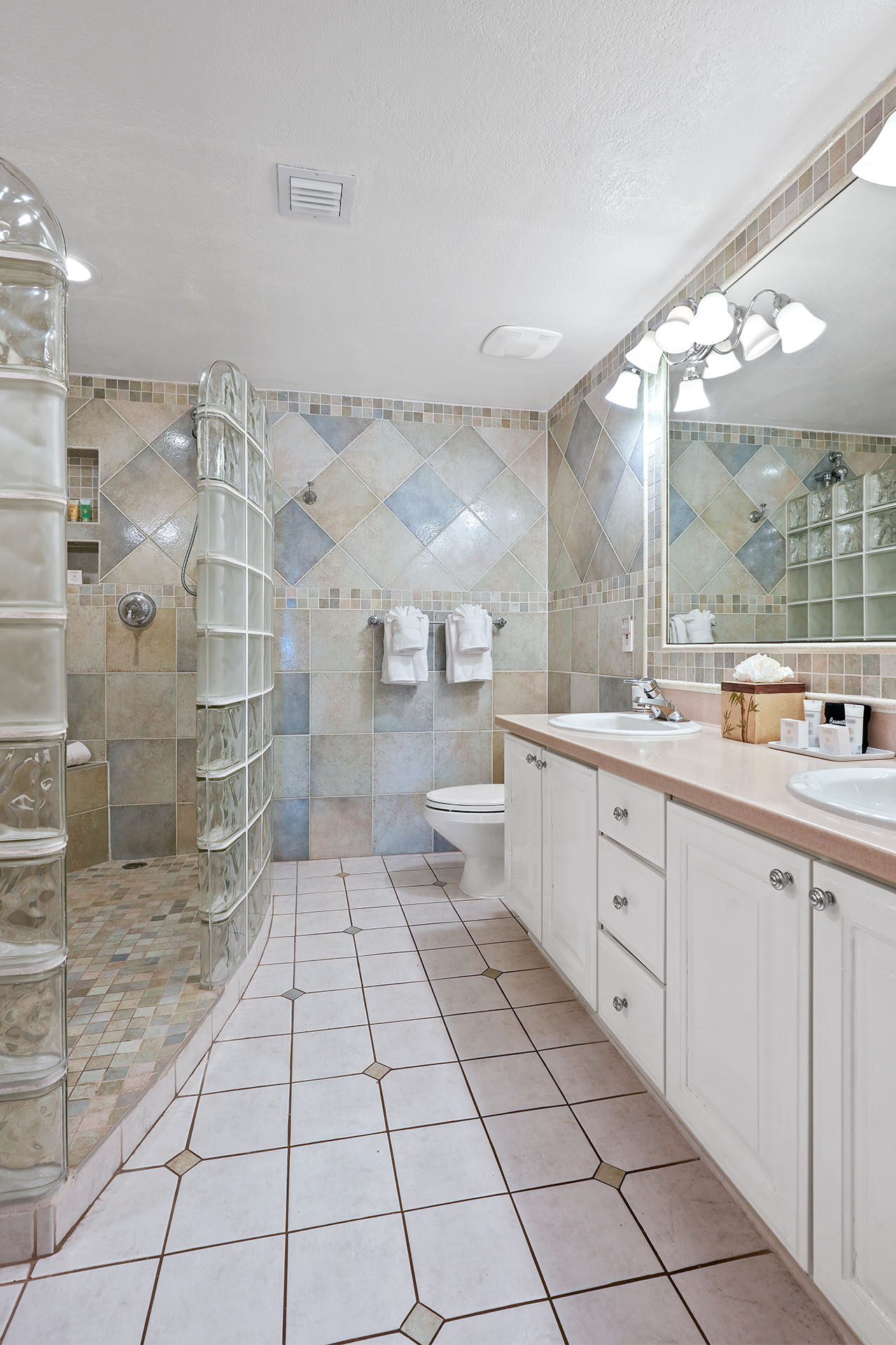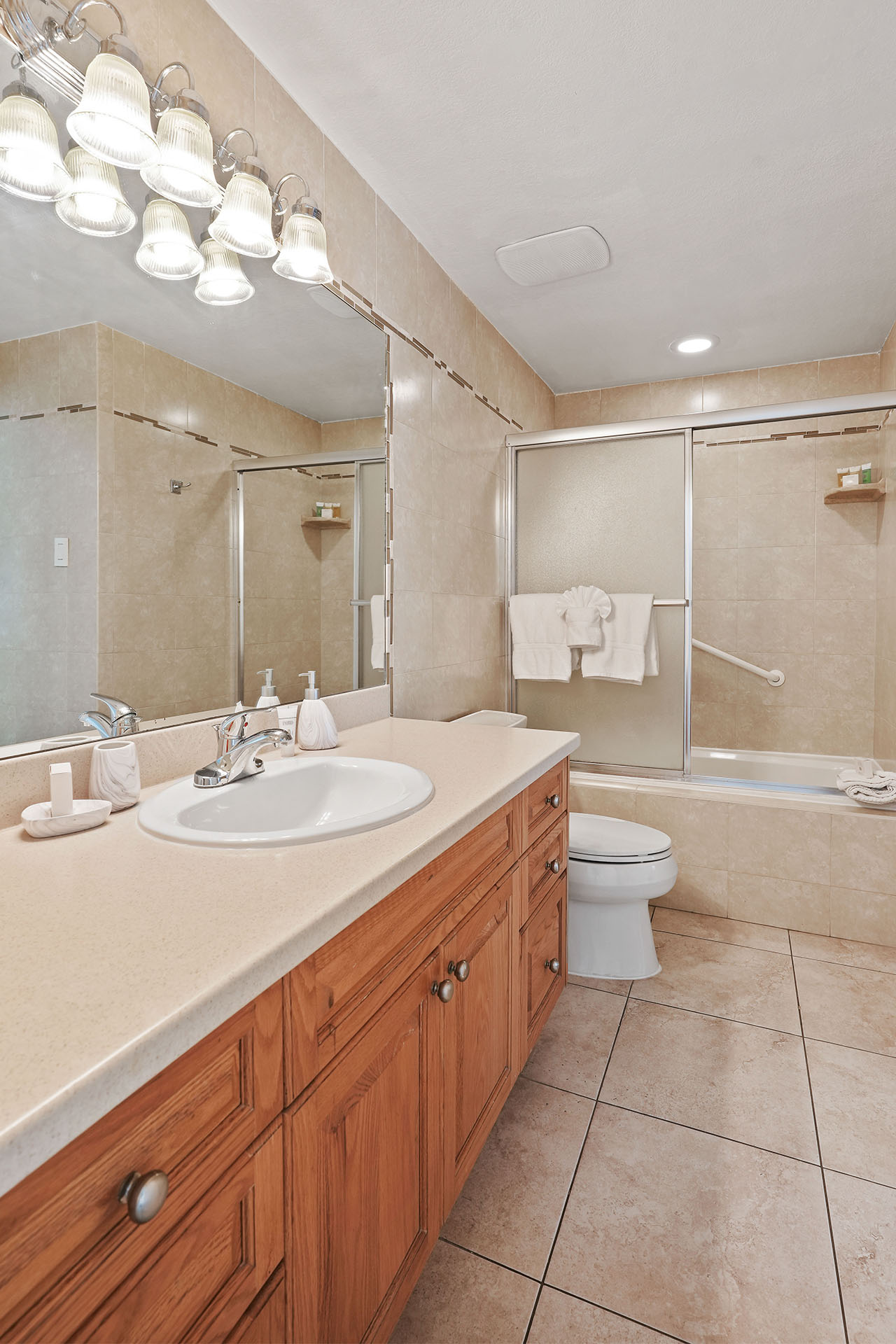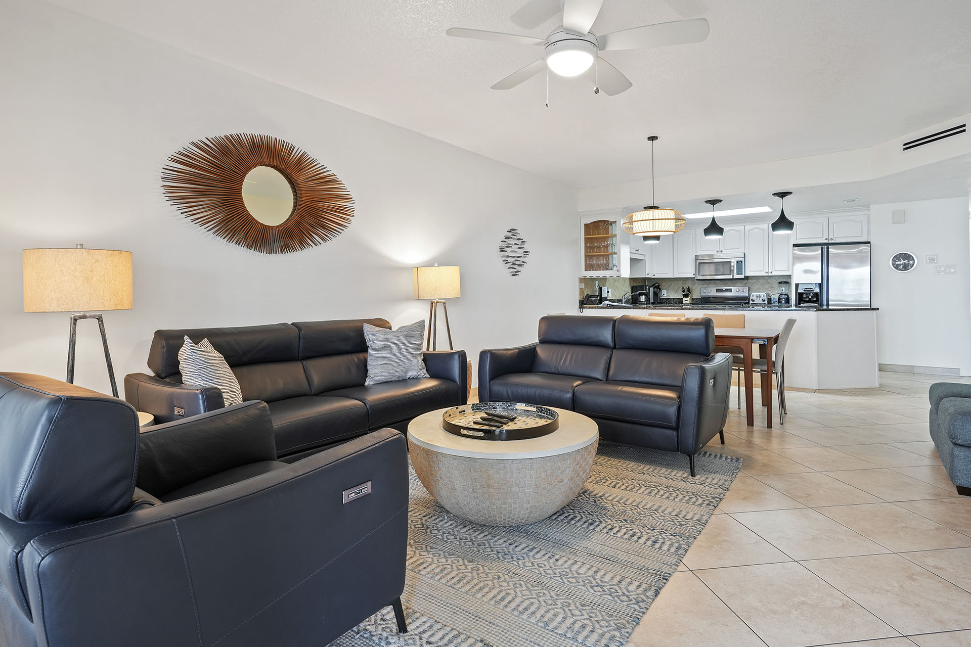 With 1,800 sq. ft of space, the three bedrooms are beautifully appointed, each featuring its own ensuite bathroom. The primary bedroom features a King size bed and a glass and tiled walk-in shower, while the guest bedroom offers a Queen bed, and an additional guest bedroom features two Twin beds that can be converted into a King bed upon request. Each bedroom is adorned with tropical linens and decor, adding to the island ambience.
